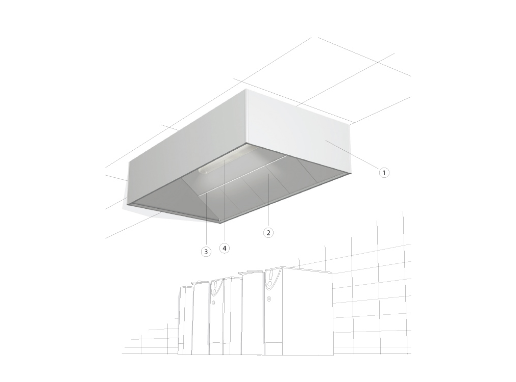Steam and excess heat are sucked up into the hood, where the condensed water is separated. The dehumidified exhaust air is discharged via the exhaust air duct. The sloping ceiling prevents condensation from dripping from the hood.