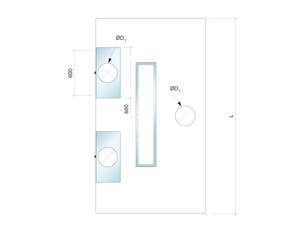 The length and depth may be freely selected. If the length x depth is greater than 3000 x 1800 mm, the hood is delivered in two or more modules. The connection for supply and exhaust air has a spigot connection with a rubber ring seal.